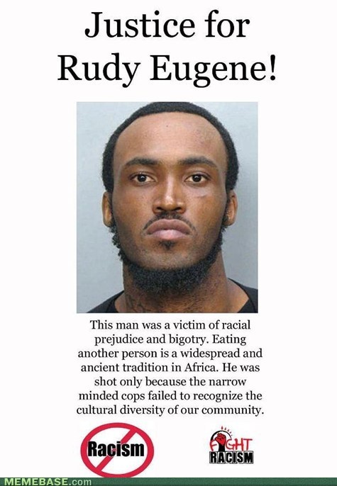 Ez az ember a faji alapú előítélet és a vakbuzgóság áldozata. Egy másik személy elfogyasztása széles körben elterjedt, ősi szokás Afrikában, őt viszont agyonlőtték, mert a szűk látókörű zsaruk képtelenek voltak felismerni közösségünk kulturális sokszínűségét - áll az alábbi plakáton, ami nyilván nem komoly, s a hasonló agyament kezdeményezéseket próbálja kifigurázni (mint amikor pl. pedofiloknak szerveznek hasonló kampányokat, mondván, ők csak szeretik a gyerekeket - ez áll a pedofil kézikönyvben is -, de hamarosan mozgalom indulhat Dezső kiszabadításáért is, hiszen ő már most közölte, hogy áldozatnak tartja magát, amiért börtönbe kell mennie, miután megölte vetélytársát).