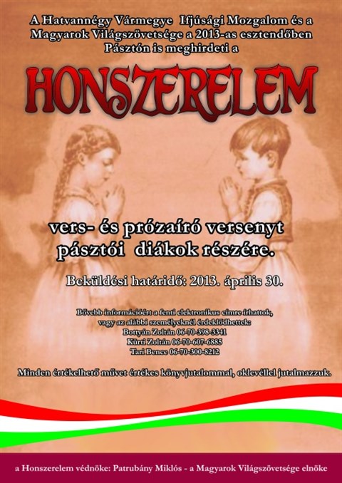 A Hatvannégy Vármegyei Ifjúsági Mozgalom és a Magyarok Világszövetsége a 2013-as esztendőben Pásztón is meghirdeti a Honszerelem vers- és prózaíró versenyt elsősorban pásztói általános és középiskolás diákok részére, de mindenkitől szívesen fogadnak beküldött írásokat.