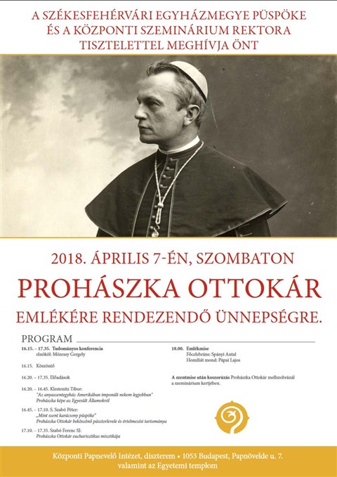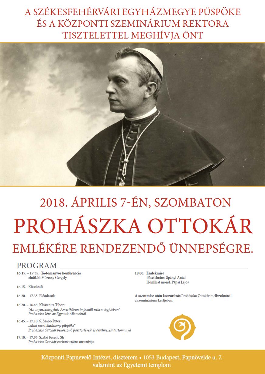 A Székesfehérvári Egyházmegye és a Központi Szeminárium szervezésében a Papnevelő Intézet dísztermében (1053 Budapest, Papnövelde u. 7.) konferenciával, valamint az Egyetemi templomban 18 órakor kezdődő szentmisével emlékeznek Prohászka Ottokár püspökre, halálának 91. évfordulójára, 2018. április 6-án.