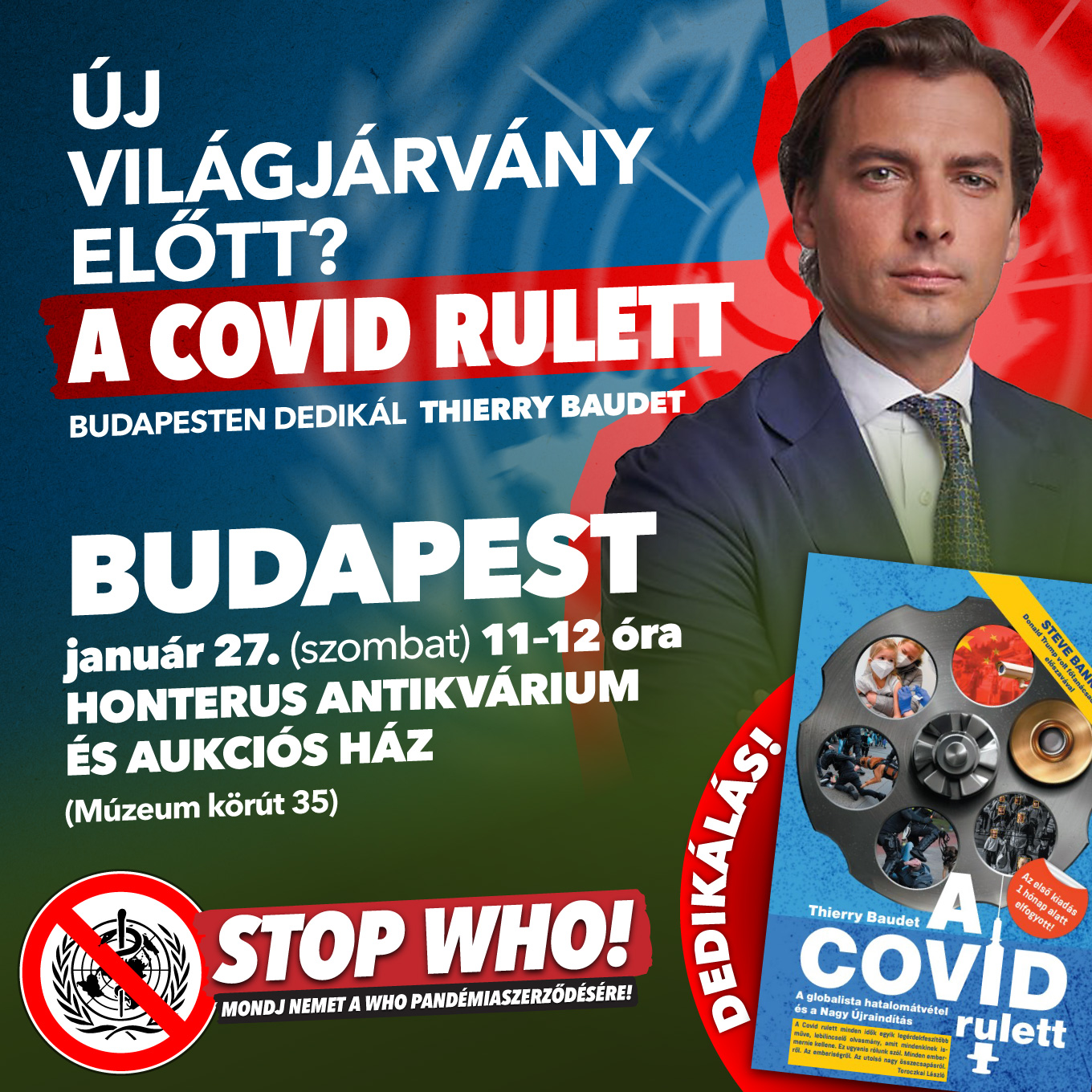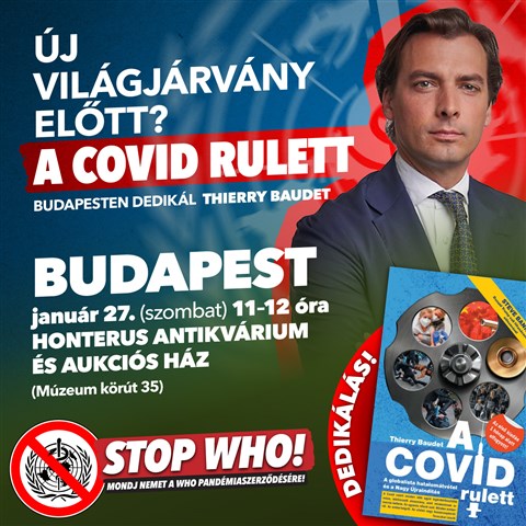 Január 27-én, szombaton 11.00-12.00 óra között Budapesten a Honterus Antikvárium és Aukciós Házban dedikálja A Covid rulett című nagy sikerű könyvét Thierry Baudet. A holland parlamenti képviselő kötete múlt év augusztus végén jelent meg és szinte pillanatok alatt elkapkodták, mára pedig a második kiadás is a végét járja.