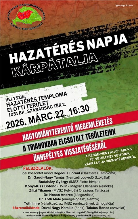 Az Igazságot Magyarországnak Szövetség Kárpátalja visszacsatolását ünnepli 2026. március 22-én.