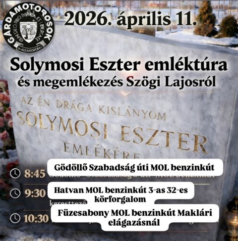 Mint minden évben, idén is megemlékeznek Solymosi Eszterről és Szögi Lajosról a Gárdamotorosok. Szombaton 8:45-kor a gödöllői Mol-benzinkútról indulnak. Becsatlakozni Hatvanban 9:30-kor és Füzesabonyban lehet 10:30-kor. A megemlékezés Tiszaeszláron a temetőben 14 órakor kezdődik. A megemlékezés után közösen mennek Olaszliszkára.
