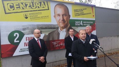 Egy héttel a megyei választások előtt a nyelvtörvényre hivatkozva leragasztatta a szlovák kulturális minisztérium a Magyar Közösség Pártjának (MKP) több választási óriásplakátját – jelentették be pénteken, Párkányban tartott sajtótájékoztatójukon a felvidéki magyar párt politikusai.