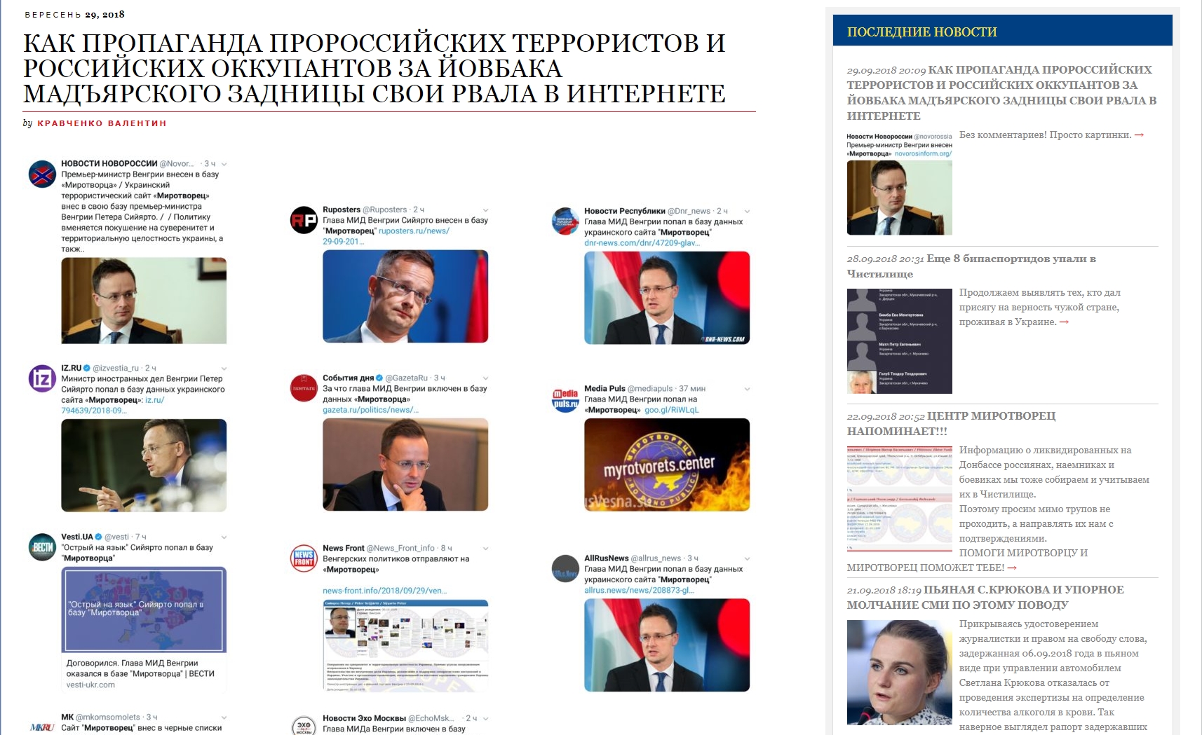 A weboldal közli a tárcavezető születési dátumát és azt, hogy mióta tölti be jelenlegi tisztségét. Döntését a Mirotvorec Szijjártó Péter szeptember 26-án New Yorkban tett nyilatkozatával indokolta, amely szerint "amíg Ukrajnát a jelenlegi elnök vezeti, addig az ukrán állam által vezetett és inspirált, a magyarokkal szembeni hangulatkeltésre alapuló politika nem is fog megváltozni, mert az államfő azt gondolja, ez lehet az egyik eszköz arra, hogy némi társadalmi támogatottságot szerezzen, jelenlegi támogatottsága ugyanis alacsony".
