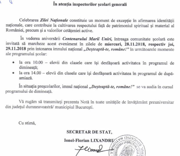 A körlevelet aláíró Ionel Florian Lixandru államtitkár közli főtanfelügyelőkkel: az iskolákban délelőtt 10 órakor, illetve (délutáni oktatás esetén) 14 órakor kell elénekelniük a himnuszt a diákoknak.
