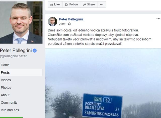 A parameter.sk vette észre, hogy Peter Pellegrini tót kormányfő méltatlankodott a Facebookon (!) amiatt, mert a felvidék 63-as főútjának egyik tábláját „magyarították”.