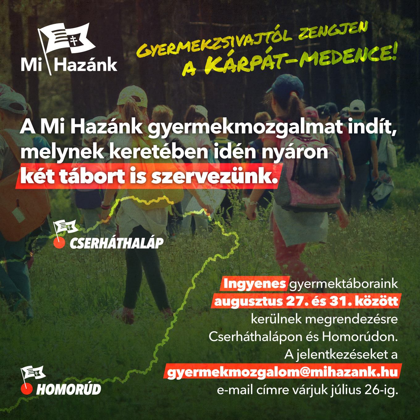 Két ingyenes gyermektáborral veszi kezdetét a mozgalom, melynek helyszínei: Cserháthaláp és Homorúd.