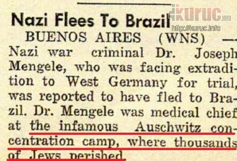 A náci háborús bűnös dr. Joseph Mengele, aki számolt a Nyugat-Németországba történő peres kiadatással, a jelentések szerint Brazíliába szökött. Dr. Mengele orvosi vezető volt a hírhedt auschwitzi koncentrációs táborban, ahol zsidók ezrei pusztultak el."