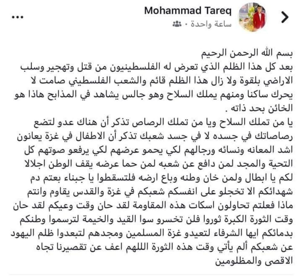 „A palesztinokat gyilkolják, a földjeiket elveszik, de ők csak hallgatnak, semmit nem tesznek. Áruló az, akinek van fegyvere és csak üldögél, békésen szemléli a mészárlást. Akinek akárcsak egyetlen marokfegyvere van, annak tudnia kellene, hogy hol van az ellenség, akire célozni és lőni kell, s nem pedig a palesztin népre”, írja egyértelműen a Palesztin Nemzeti Hatóság rendőreire célozva a támadást elkövető palesztin fiatal, majd a másfél évtizede izraeli blokád alatt levő Gázai övezetbeli eseményeket is megemlítve, így folytatja: „Azt sem szabad elfeledni, hogy a Gázai övezetben élő gyermekek, asszonyok és férfiak mennyit szenvednek. Elérkezett az ideje a forradalomnak.”