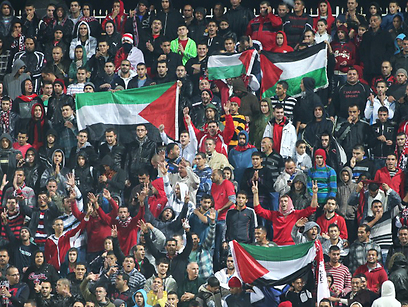 ![]() A Szahnín szurkolói palesztin zászlókkal |