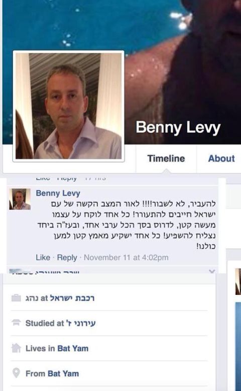 Benny Levy ugyan azóta törölte facebookos oldalát, de nem ő az egyetlen zsidó, aki gyűlöletet kelt a palesztinok ellen, sőt, a meggyilkolásukra buzdít. Jamal Zahalka, az izraeli parlament, a Knesszet egyik arab képviselője, facebookos bejegyzésében „halálos rasszizmusnak” nevezte a mozdonyvezető felhívásában foglaltakat, és bírálta az izraeli hatóságokat, amiért nem indítanak eljárást az ügyben. A palesztin politikus szerint nem elegendő, ha csupán a vasúttársaság foganatosít valamiféle büntetést az arabok ellen uszító férfi ellen.