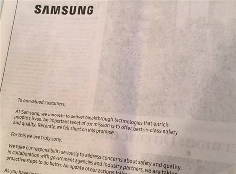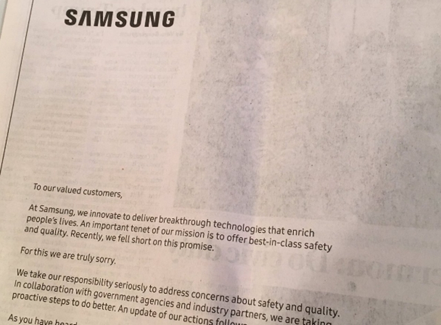 Egész oldalas bocsánatkérés jelent meg a Samsungtól a Wall Street Journalban, a New York Timeban és a Washington Postban, természetesen a Galaxy Note7 visszahívásával kapcsolatban.