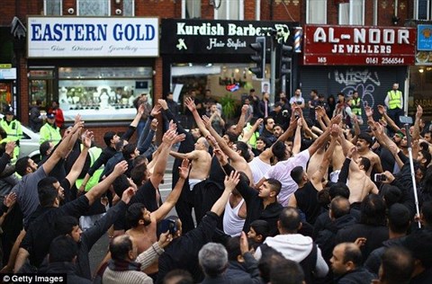 ![]() Ásúráünnep Manchester Rusholme nevű kerületében - ekkor szokták egyébként véresre vagdosni a fejüket a buzgó mohamedánok |