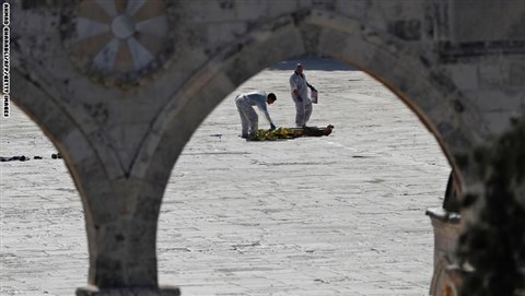 Később azonban elárulták az izraeli rendőrök, hogy a sebesülésébe belehalt két izraeli személy a kollégájuk, tehát a tűzpárbajban résztvevő rendőrök voltak, míg a közepes mértékben megsebesített izraeli kilétéről még mindig nem lehet tudni semmit, de valószínűleg ő is rendőr. Az Oroszlános kapun keresztül behatolva a három fegyveres palesztin az első tűzharc után a Templom-hegy térségére menekült, ahol tovább viszonozták a tüzet az izraeli rendőrökre. Az El-Aksza mecset árkádja fedezékében készült videón látható az, amint az egyik palesztint már meglőtték az izraeli rendőrök, azt hitték róla, hogy akcióképtelen, amikor az hirtelen fölugrott, és ismét tüzelni kívánt az izraeliekre. Végül az izraeli rendőrök a Templom-hegyen mindhárom palesztint agyonlőtték.