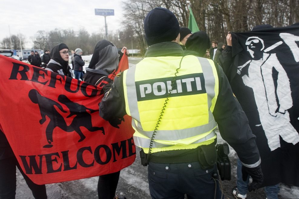 ![]() Migránssimogató és hazájukat védő tüntetők a dán-német határon, Krusaaban 2016 januárjában (Kép: AFP/Claus Fisker) |