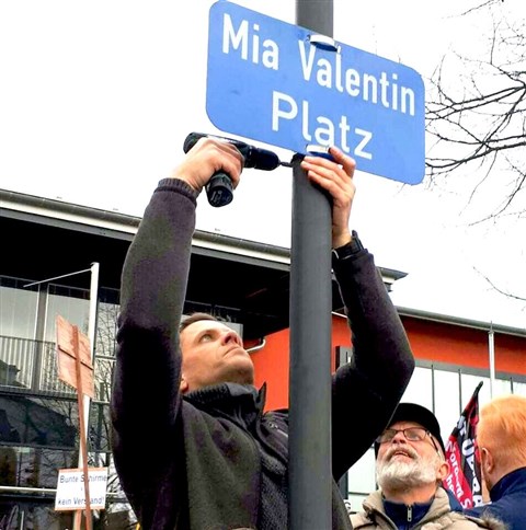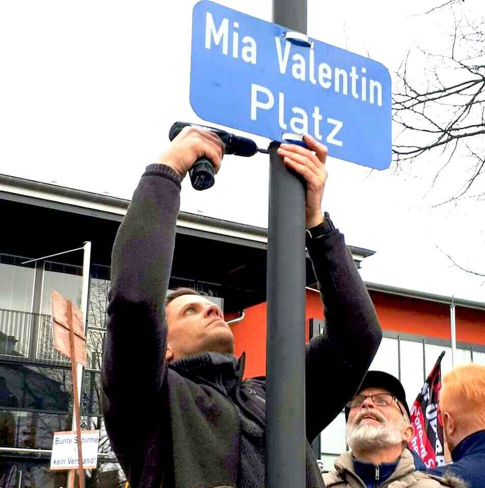 Kandel városka piacterét a tüntetés idején a tömeg követelésére az egy hónappal ezelőtt meggyilkolt lányról elnevezve átkeresztelték Mia Valentin térnek. Egy ügyes kezű tüntető a jelenlevők helyeslése közepette egy vasoszlopra gyorsan föl is szerelte a Mia Valentin Platz föliratú közterületnév-táblát. Ez a tábla már valószínűleg nincs ott, mert a szocifertőzött polgármesteri hivatal képviselő-testülete, élén az SPD-és Volker Poß polgármesterrel, ezt az átnevezést utólag nem fogja jóváhagyni. Volker Poß, a városka polgármestere pártbeli főnökéhez, a nyolc általánossal nem is olyan régen még a kancellári hivatalra is ácsingózó Martin Schulzhoz hasonló azt vallja, hogy „a menekültek az aranynál is értékesebbek Németország számára.”