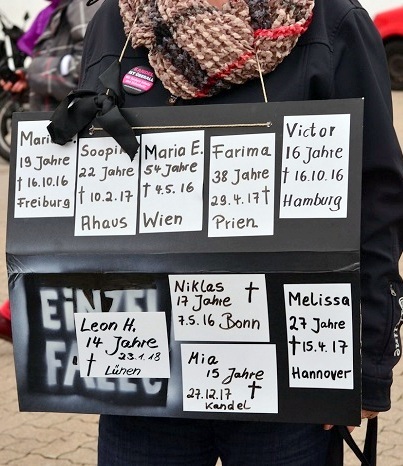 A tüntetésen fölszólalók szóba hozták, illetve valaki a nyakába akasztott transzparensre föl is írta annak a kilenc, leginkább fiatalnak a nevét, akiket az Angela Merkel és politikus bűntársai által Németországra szabadított betolakodók gyilkoltak meg. Az egyik szónok megemlítette, hogy Christian Schad, a Pfalzi Evangélikus Egyház elnöke a 15 éves Mia Valentin meggyilkolását „egyedi esetnek” (Einzelfall) nevezte. Gyorsan meg kell jegyeznünk, hogy ilyen gazemberek - lásd a kölni érseket - a katolikus egyházban is szép számmal előfordulnak, s nem csak Németországban.