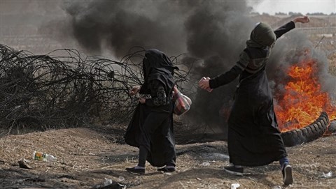![]() Palesztin tüntetők a határkerítés túloldalán levő izraeli katonákkal történő összecsapás közben Gáza városától keletre 2018. április 13-án (Fotó: MTI/Mohammed Szaber) |