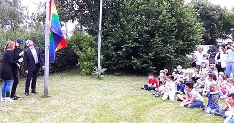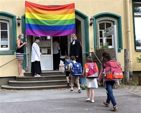 Az Észak-Rajna-Vesztfália szövetségi tartományban az idén augusztus 13-án volt az alsó tagozatos kisiskolások beíratása a tanintézetekbe. A tartománybeli Moers városban az evangélikus templom Fb-oldalára azonban csak hat nappal később tették ki azt a fényképet, amelyen az látható, hogy „tanítók” és az evangélikus „lelkésznő” az első osztályba beiratkozott gyermekeket a tanintézet bejárata fölé kifeszített deviánszászló alatt vonultatta be az épületbe.