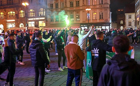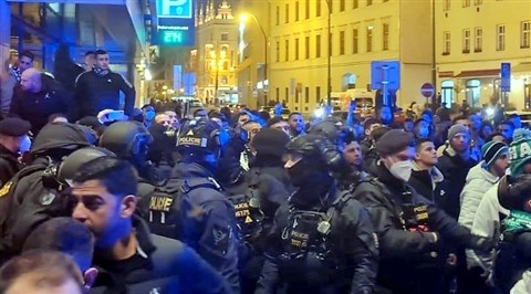 A prágai rendőrség kezdetben engedélyezte a mérkőzés helyszínére tartó Makkabi-szurkolóknak az utcai vonulást, de a rendőrök felléptek velük szemben, amikor az izraeliek elkezdtek pirotechnikai eszközöket hajigálni. Az izraeli szurkolók állítása szerint a rendőrök túlzott erővel és nagyon agresszíven léptek föl ellenük, mire dulakodás kezdődött. A rendőrség az említett incidens miatt tegnap 16 órakor megállította a vonulást, s a szurkolókat nem engedte továbbhaladni. Közben a cseh szurkolók is megjelentek a helyszínen, de a rendőrök sorfallal akadályozták meg a két tábor összecsapását.