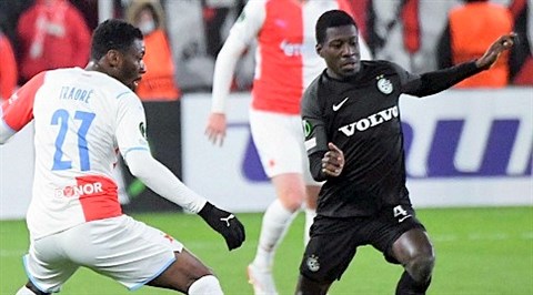 ![]() A "cseh"-"zsidó" összecsapás egyik jelenete Prágában: Ibráhím Benjamin Traoré (Slavia Prága) és Áli Muhámmád (Makkabi Haifa) |