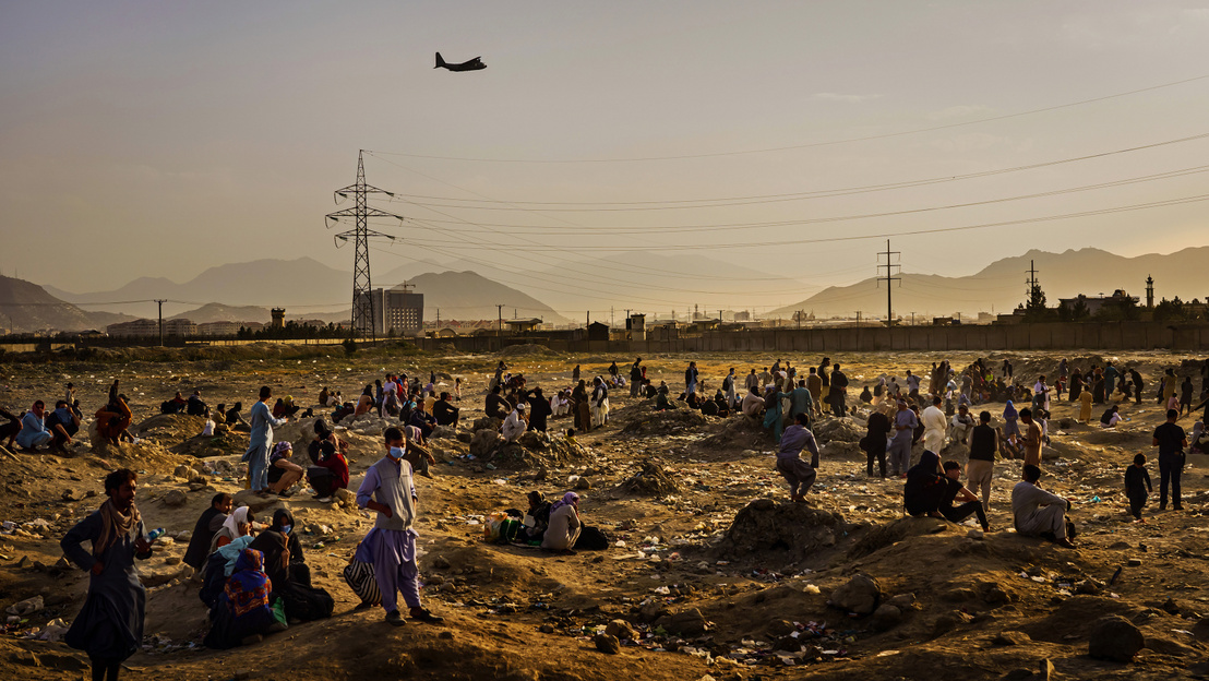 ![]() Katonai szállító repülőgép száll az égen, miközben az ország elhagyásában reménykedő afgánok a kabuli repülőtér előtt várakoznak 2021. augusztus 23-án (fotó: Marcus Yam / Getty Images) |