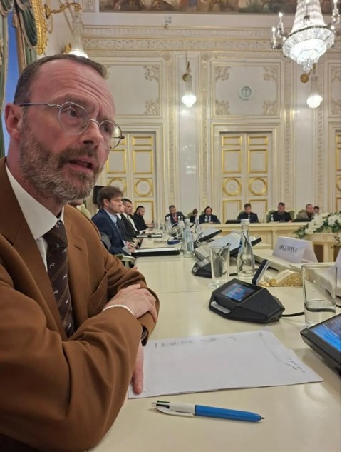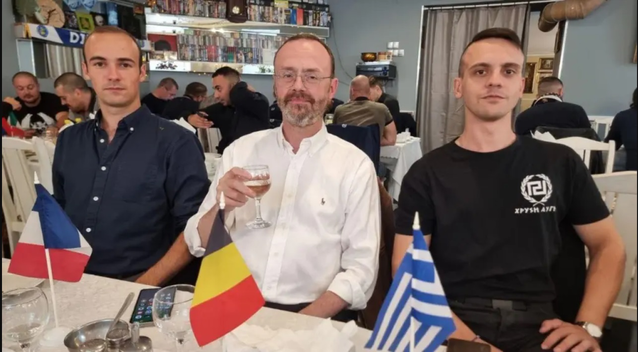 ![]() Van Laethem a francia Nacionalisták és a görög Arany Hajnal képviselőivel Szentpéterváron. (kép: Nation.be) |