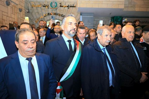 ![]() Középütt: Máher Kanavátí, Betlehem polgármestere (a vállán palesztin zászló), tőle jobbra: Ramzí Khúrí, a PFSZ VB-nak tagja (fotó: Fb.) |