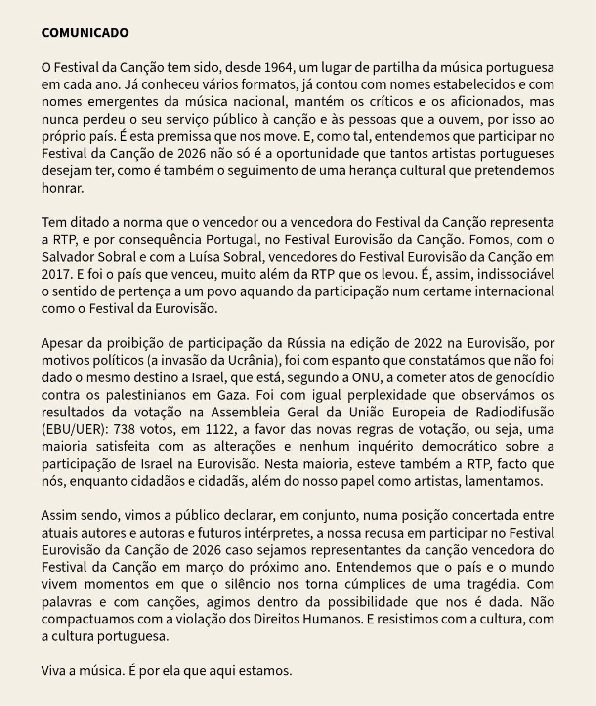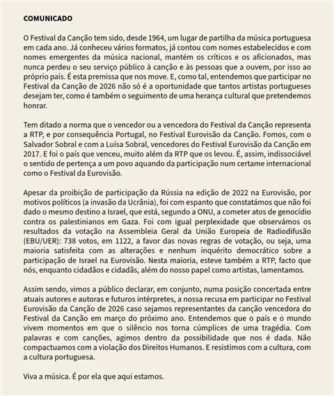A közleményt aláíró egyben sajnálatuknak adnak hangot, amiért a portugál közszolgálati műsorszolgáltató (RTP) az Európai Műsorsugárzók Uniójának (EBU) legutóbbi, genfi közgyűlésén megszavazta Izrael részvételét az Eurovíziós Dalfesztiválon. Közben a zsidó népirtókkal cinkos Portugál Rádió és Televízió (RTP) bejelentette: tiszteletben tartja a 17 művész döntését, ám Portugália mindenképpen részt vesz a jövő évi Eurovíziós Dalfesztiválon.