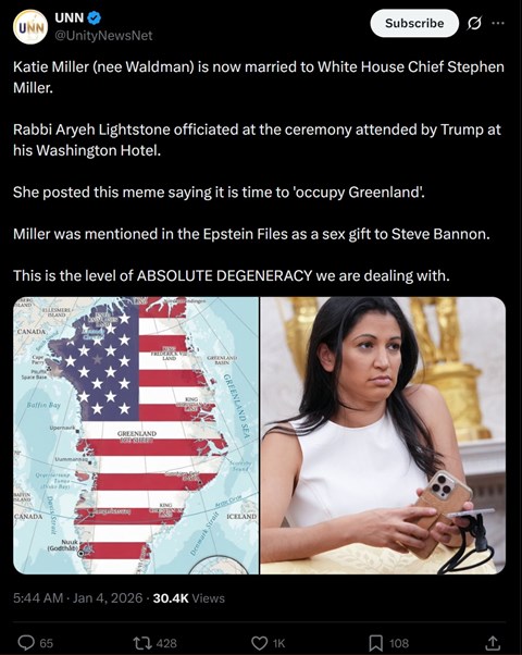 Az elnök kijelentése összefügg egy X-bejegyzéssel, amit Katie Miller, a Trump-kormányzat korábbi tisztviselője, egyben Stephen Miller, az amerikai elnök egyik legbefolyásosabb tanácsadójának felesége osztott meg. A bejegyzésben Grönland az amerikai zászló színeibe burkolva látható, rajta a sokatmondó "soon", vagyis hamarosan felirattal. A bejegyzés gyors diplomáciai reakciót váltott ki. Jesper Moller Sorensen, Dánia washingtoni nagykövete közvetlenül reagált. Jelezte, hogy Dánia "elvárja a Dán Királyság területi integritásának teljes tiszteletben tartását".