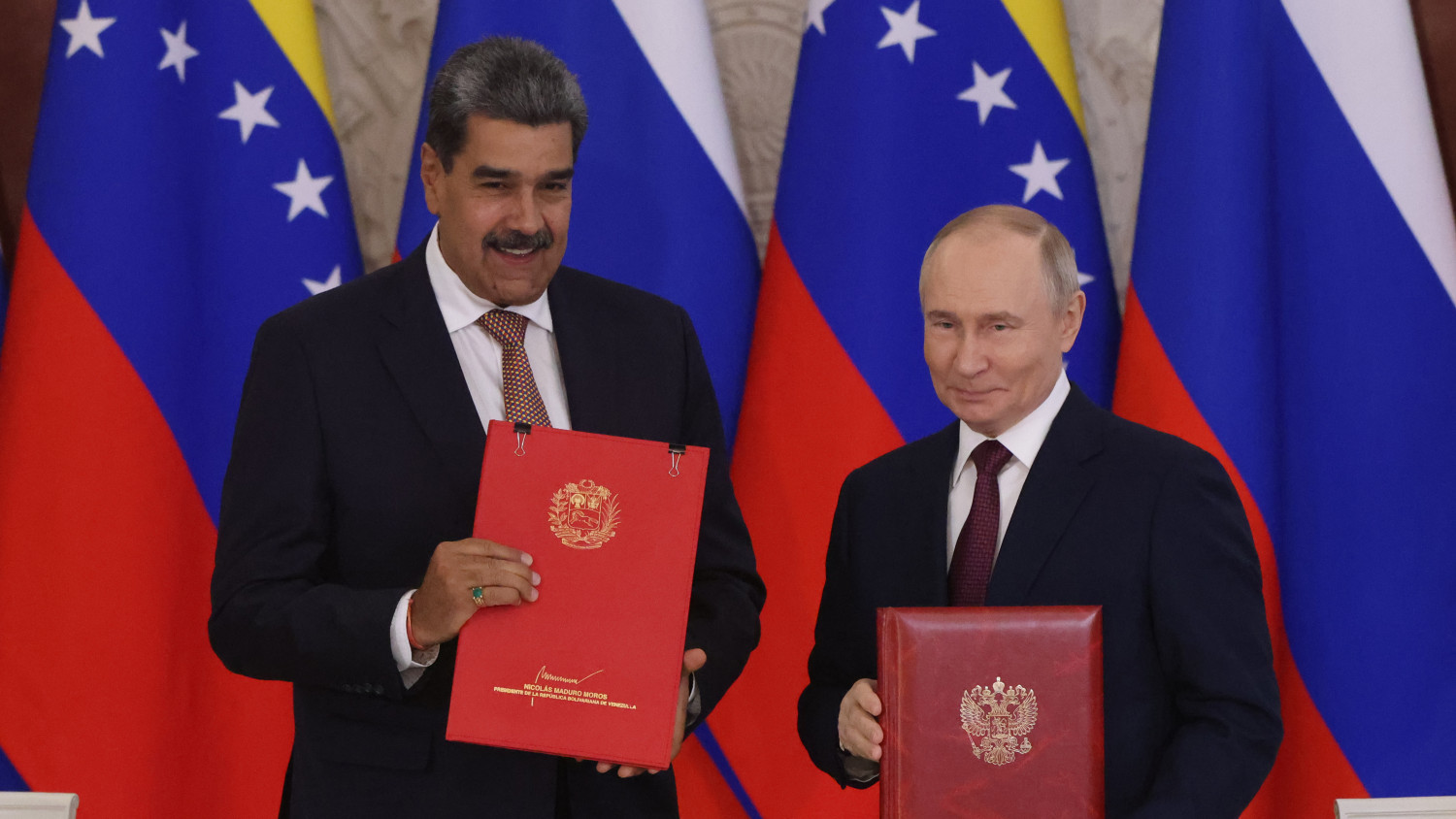 ![]() Nicolás Maduro venezuelai és Vlagyimir Putyin orosz elnök a két ország közötti stratégiai partnerségi és együttműködési szerződés aláírása után Moszkvában 2025. május 7-én. Forrás: Getty Images |