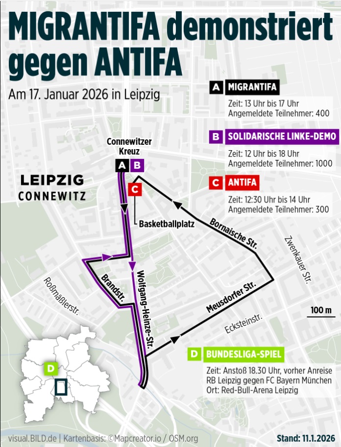 Hogy még színesebb legyen a kép, a zsidópárti Antifa azt híreszteli, hogy a Migrantifa soraiba be akar szivárogni a szélsőjobboldal, hogy antiszemita indíttatásból csapást mérhessenek a zsidófészek Connewitzre, de az se teszi könnyebbé a rendőrségi műveleteket, hogy szintén szombaton játsszák a városban az RB Leipzig - Bayern München Bundesliga-mérkőzést. A rendőrség attól tart, hogy a szurkolók és huligánok is összecsaphatnak a szélsőbaloldali frakciókkal és egymással is.