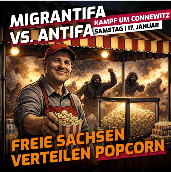A nacionalista Freie Sachsen közleményben tudatta, üdvözli, hogy a szélsőbal egymást kívánja ütlegelni, s nem a német hazafiakat zaklatják, valamint pattogatott kukoricával készülnek az eseményre.