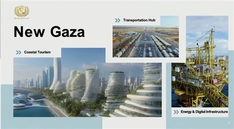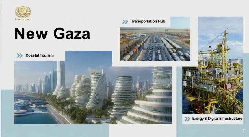 Jared Kushner már 2019-ben is kidolgozott egy sokat kritizált palesztin béketervet, amelyet a Fehér Ház az „évszázad megállapodása”-ként reklámozott. A Békétől a Jólétig címet viselő tervezet 50 milliárd dolláros befektetéssel számoló gazdaságpolitikai fejezetét szerzője a Marshall-tervhez hasonlította. Donald Trump második ciklusának elején pedig bejelentette, hogy az Egyesült Államok kezelésbe venné a Gázai övezetet, amelyből „közel-keleti riviérát” építene – miközben a kétmilliós palesztin lakosság jelentős részét kitelepítené. A „Gaz-a-Lago-tervet” később Trump közel-keleti szövetségesei nyomására ejtette, azonban a vízió azóta is visszaköszön izraeli szélsőjobboldali politikusok által publikált MI-videókon.