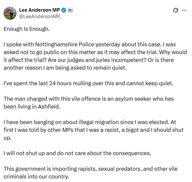A 28 éves pakisztáni állampolgárt, Sheraz Malikot bűnösnek találták egy tizenéves lány megerőszakolásában, akit a férfi és egy barátja támadott meg egy parkban Lee Anderson, a Reform Párt parlamenti képviselőjének választókerületében. A politikus 2025-ben leplezte le, hogy Malik menekültstátuszt kért az Egyesült Királyságban, majd letartóztatták egy 18 éves nő elleni támadás miatt Nottinghamshire-ben. Sheraz Malik egy államilag finanszírozott szálláson lakott, miután Olaszországon, Németországon és Franciaországon keresztül az Egyesült Királyságba érkezett.