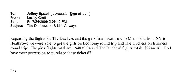 Sarah Ferguson – ismert becenevén Fergie – és két lánya, Beatrice és Eugenie repülőjegyei csaknem 15 000 dollárba (mai árfolyamon körülbelül 4,8 millió forintba) kerültek. Utazásuk célja az volt, hogy a börtönből éppen kiszabadult Epsteint szabadlábra helyezése után mindössze 48 órával meglátogathassák az Egyesült Államokban. Ferguson a London-Heathrow repülőtérről az Egyesült Államokba üzleti osztályon tervezett repülni, lányai pedig turistaosztályon utaztak – áll a 2009. július 24-én elküldött e-mailben: