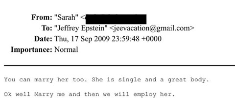 Fergie több alkalommal is azt mondta a szexuális bűncselekményeket elkövető zsidónak, hogy vegye őt feleségül, még azután is, hogy Epstein 13 hónapos börtönbüntetését letöltötte, amit azért kapott, mert 14 éves lányokkal akart szexuális kapcsolatot létesíteni. Egy 2009. szeptember 17-én elküldött e-mailben egy állítólagos barátnőjéről így írt: „Őt is elveheted feleségül. Szingli, és nagyszerű teste van.”