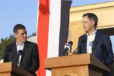 ![]() Pedro Sanchez (b) spanyol és Alexander De Croo belga miniszterelnök a rafahi határátkelőnél 2023. november 24-én. Háttérben az egyiptomi zászló (fotó: belganewsagency.eu) |