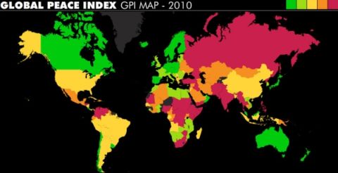 ![]() Az "Emberiség Globális Béke Indexe", ahol élénk zöld színnel jelölték a legbékésebb országokat,vörössel pedig a béke szempontjából a legveszélyesebbeket. (Forrás: www.visionofhumanity.org) |