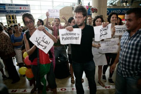 A lodi Ben Gurion Nemzetközi Repülőtéren a déli órákban az izraeli biztonságiak lefogtak öt zsidó békeaktivistát, akik az utasváróban a „Free Palestine!” (Szabadítsátok föl Palesztinát!), illetve arab, héber és angol nyelven az „Isten hozott benneteket Palesztinában” föliratos transzparensekkel kívánták fogadni a különböző országokból érkező palesztinbarát személyeket. Ám a fogadásra nem kerülhetett sor, mert az izraeli rendőrség azonnal lecsapott rájuk és letartóztatta őket. A Palesztina függetlensége mellett tüntető zsidók szóvivője a Jediot Áháronot című lapnak elmondta: „A Gázai övezetet és egész Palesztinát törvénytelen blokád alatt tartják, ezért kell támogatnunk a palesztinokat. Politikai zaklatás tanúi vagyunk, a világ minden részéből érkező békeaktivistákat és a palesztin szabadság követelőit meg kitoloncolják a Ben Gurion Nemzetközi Repülőtérről”, nyilatkozta az izraeli békeaktivista mielőtt elvitték a rendőrök.