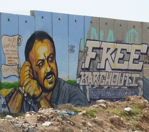 ![]() Bárgúti szabadságát követelő graffiti az „apartheidfalon” |