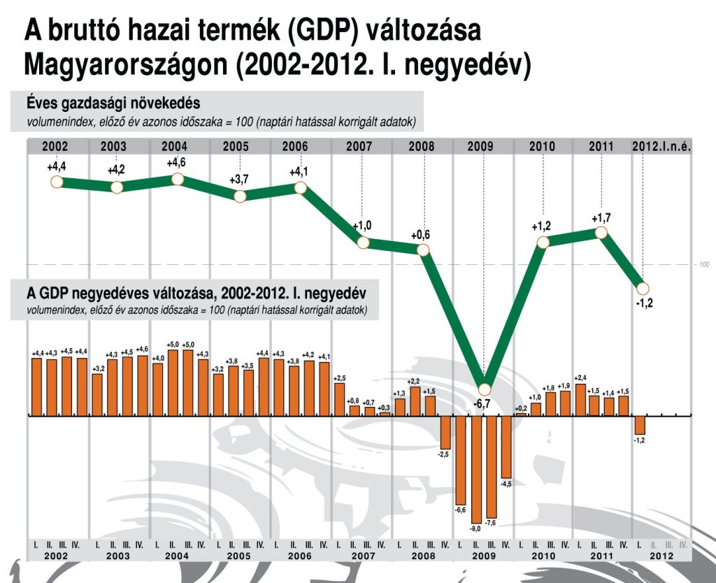 Magyarország bruttó hazai terméke az előzetes adatnak megfelelően az első negyedévében 0,7 százalékkal csökkent az előző év azonos időszakához viszonyítva - közölte a végleges adatot a KSH. A szezonálisan kiigazított adatok szerint a gazdaság teljesítménye az előző negyedévhez képest 1,2 százalékkal csökkent. Az NGM a jövőt tekintve az új Mercedes gyárban bízik és "kellemes meglepetésekre" számít.