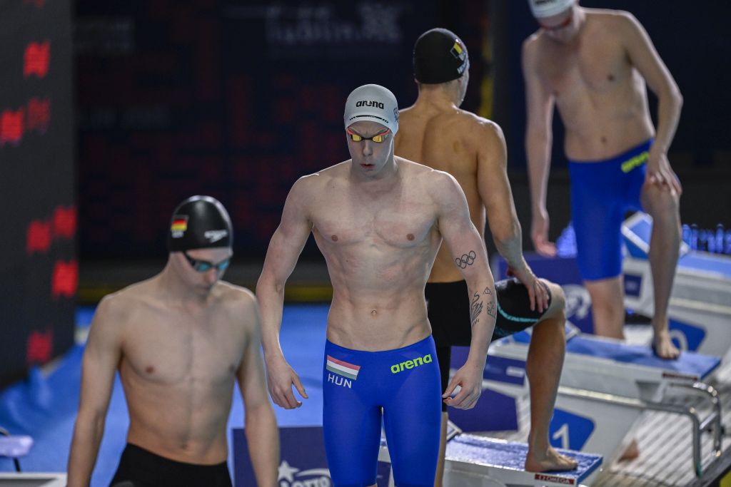 ![]() A későbbi aranyérmes Sárkány Zalán (k) a férfi 800 méteres gyorsúszás döntőjében a rövidpályás úszó Európa-bajnokságon a lengyelországi Lublinban 2025. december 6-án (kép: MTI/Bodnár Boglárka) |