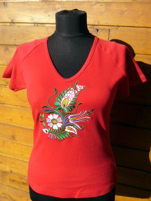 Piros színben, színes hímzéssel, S, M, L, XL, XXL méretben.