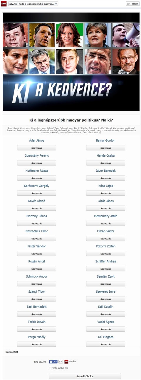 "Ki a legnépszerűbb magyar politikus? Na ki?" - olvasható a kérdés az ATV Facebook-oldalán. Már csak annyit kellett volna ehhez hozzátenni, hogy "Kire nem lehet szavazni? Na kire?"