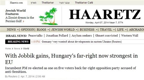 A Háárec című napilap összetett mondatos főcímben közli: "Magyarországon győzött a kormánypárt a választásokon - Megerősödött az antiszemita párt". Az egyébként mértékadónak nevezett héber nyelvű lap sem képes napirendre térni a Jobbik megerősödése fölött, amiképpen a többi, általunk a világhálón elérhető izraeli sajtóorgánum sem. A Háárec Orbán Viktor fényképe mellett Vona Gáborról és kisfiáról a a szavazóurnánál készült fotóját mellékeli a magyarországi választásokról szóló hírhez. A Fidesz győzött, megőrizte eddigi kétharmados többségét is, írja a Háárec, ám gyorsan hozzáteszi: "Orbán legutóbb arról is gondoskodott, hogy az új budapesti metró egyik állomásán kőbe véssék a nevét."