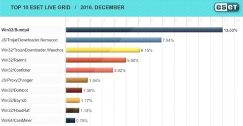 A decemberi adatokból most összeállított listán első helyen végzett a Win32/Bundpil féreg, amely külső adathordozókon terjed, és komoly károkozásra is képes, hiszen a meghajtóinkról mind a futtatható, mind pedig a biztonsági mentéseket tartalmazó állományokat törölheti. Ezzel pedig a zsarolóprogramok kezére játszik, hiszen mentések hiányában egy fertőzés utáni helyreállítás akár lehetetlen feladatnak is bizonyulhat.