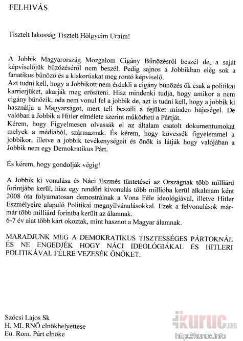 Amint azt már tudjuk róla, nem szereti a Jobbikot, és az is ismert olvasóink előtt, hogy igencsak hadilábon áll a magyar helyesírással. Sok újdonság tehát nincs abban a levélben, amellyel a napokban a falut teleszórta, szórakozni viszont kiválóan lehet ezen az alkotásán is.