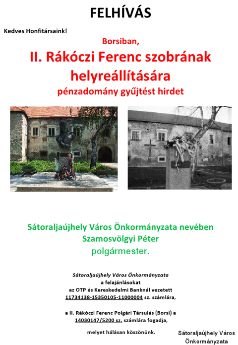 A Rákóczi-szobor helyreállítására gyűjt Sátoraljaújhely