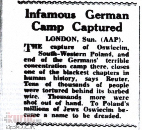 Egy másik érdekesség egy Reuter-jelentést közlő kis cikk, amely közvetlenül Auschwitz szovjetek általi elfoglalását követően került a szintén Ausztráliában kiadott The Mercury oldalára 1945. január 29-én.